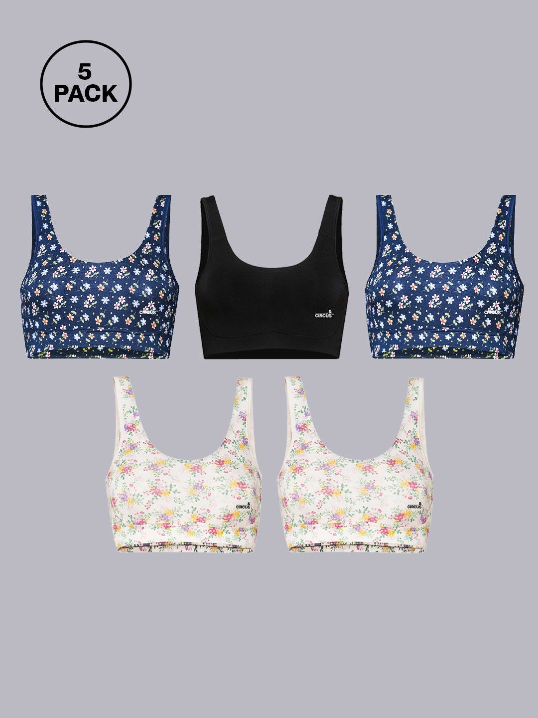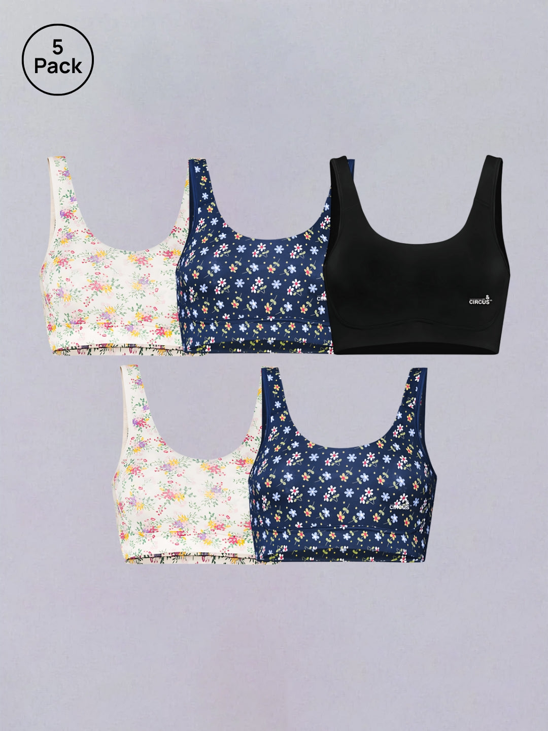 &Circus low impact sports bras for women are designed to give you additional support without discomfort; these bras have no pads, no hooks, no wires, just slip-on comfort. Our Summer Bouquet, Wedding Day, & Jet combo pack of 5 low-impact sports bras is ideal for low-impact activities throughout the week. Summer Bouquet: A little floral arrangement of love. A reflection of your cheer and a mark of your bright spirit. Wedding Day: The perfect piece of art inspired by the most important day in your life. A beautiful floral celebration to love you. Jet: A clinical edge to match what you bring to the table. Take it all in. Focus on just one. The low impact sports bras are available in sizes from S-2XL.