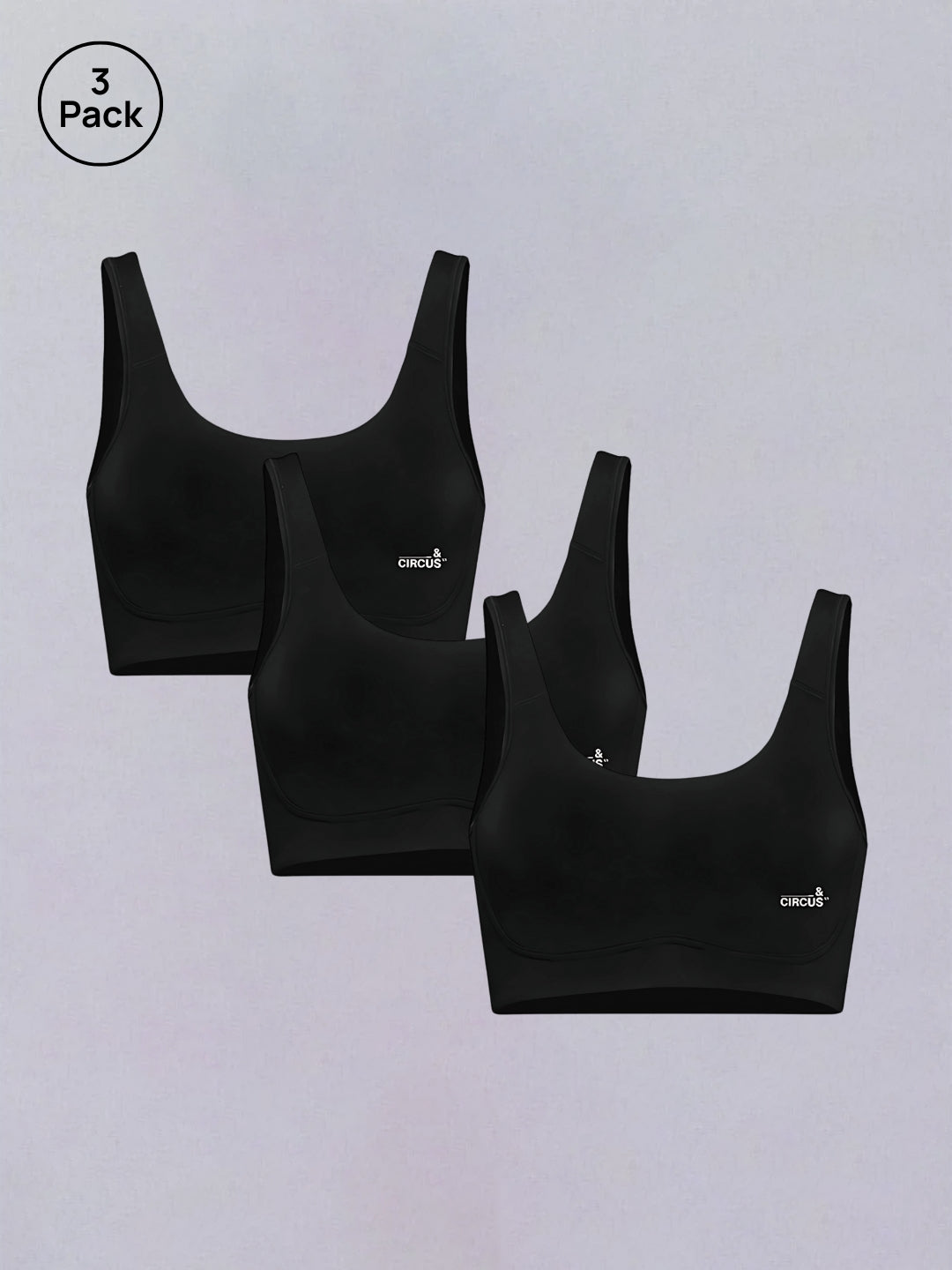 &Circus low-impact sports bras for women are designed to give you additional support without discomfort; these bras have no pads, no hooks, no wires, just slip-on comfort. Our Jet pack of 3 bras is ideal for low-impact activities throughout the week. Jet: A clinical edge to match what you bring to the table. Take it all in. Focus on just one. Pack of 3 Jet low-impact sports bras is available in sizes from S-2XL.