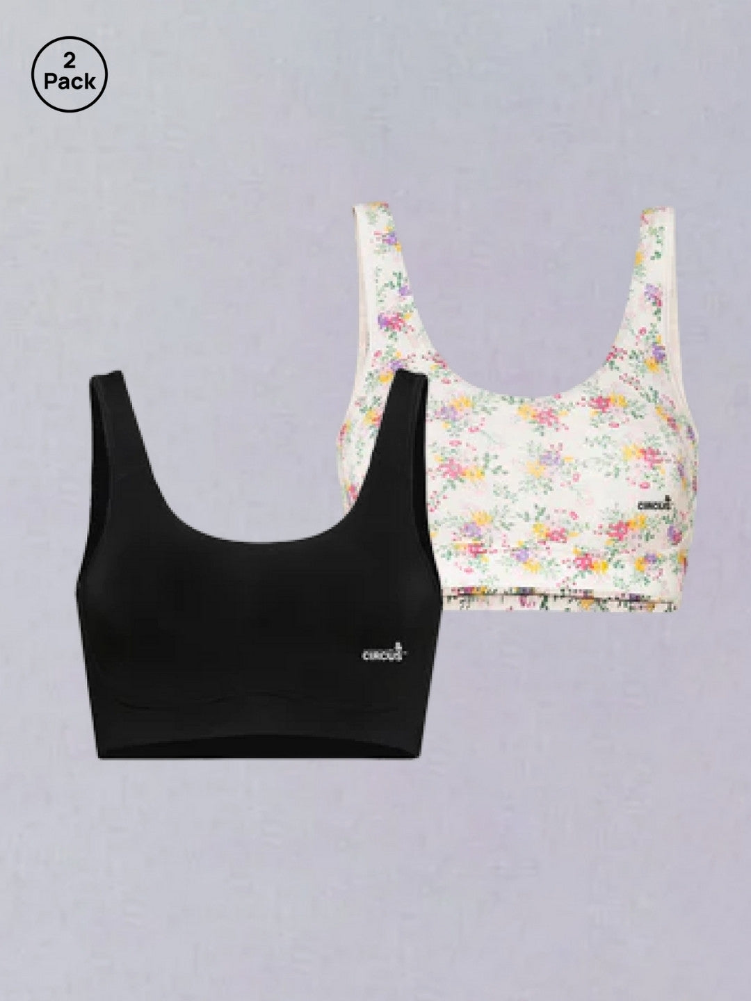 &Circus low-impact sports bras for women are designed to give you additional support without discomfort; these bras have no pads, no hooks, no wires, just slip-on comfort. This combo features two distinct moods: Summer Bouquet & Jet.