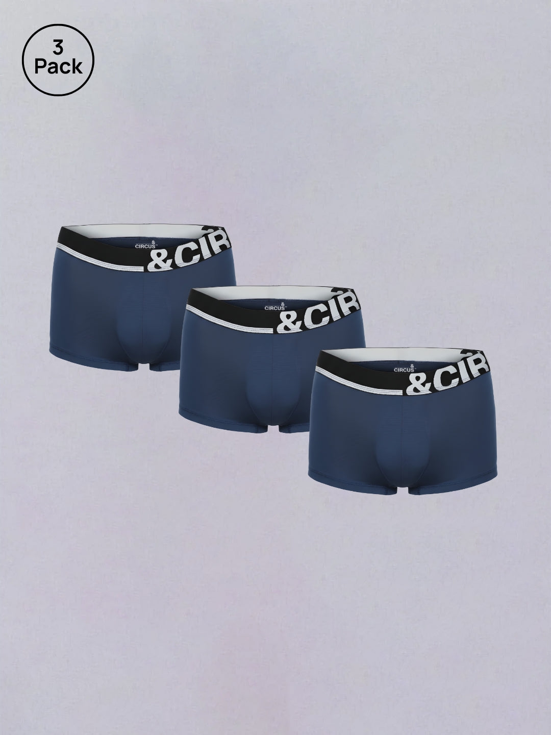 &Circus Men's trunks from the AirSoft collection are lightweight everyday essentials, built to give you a fine blend of comfort, style, and performance, with full coverage & adaptive pouch. Midnight Blue: The colour of the new year. Rich but chirpy. Sharp but silly. The you after the sun sets. Our solid Midnight Blue pack of 3 trunks is available in sizes from S-2XL.