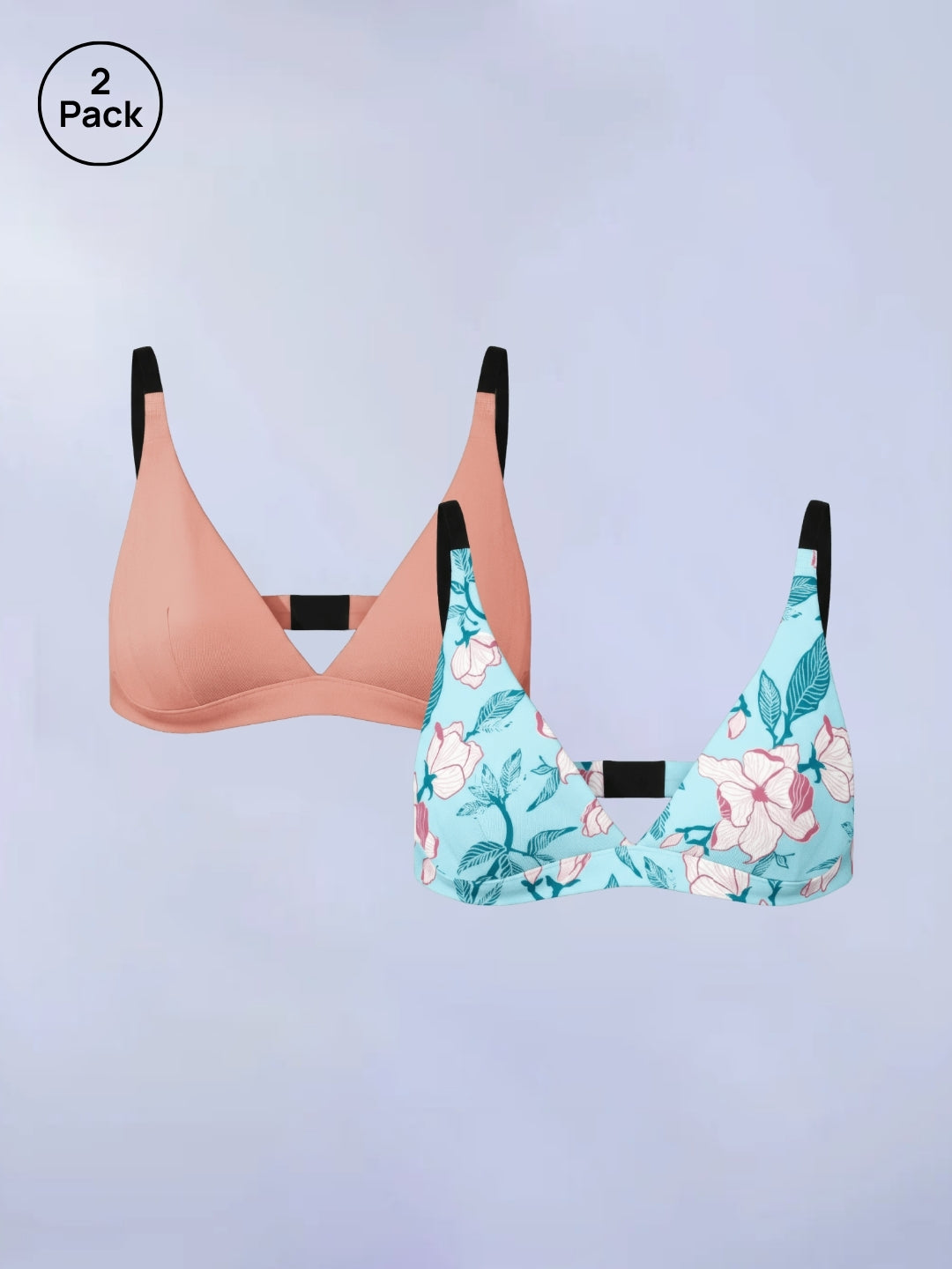 Our Spring & Almond Nude Pack of 2 Solid & Printed triangle bras are a true no-show showstopper. Available in sizes XS-3XL.