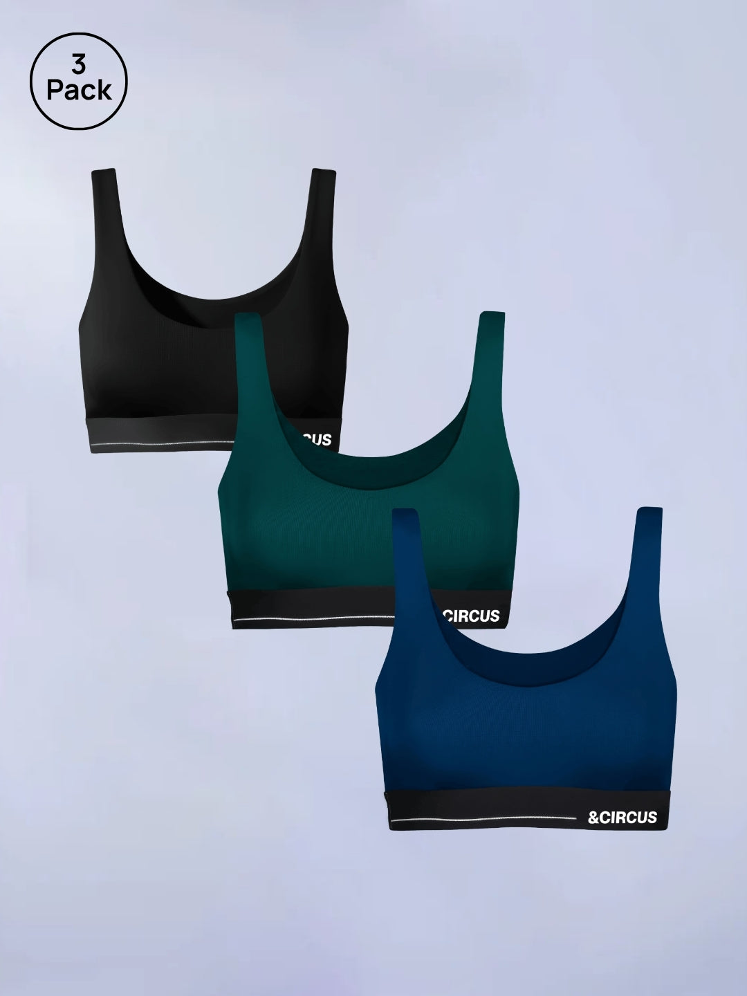 &Circus Pack of 3 Onyx, Racing Green & Blue Curacao low-impact lounge bras for women are designed to give you support without discomfort; these bras have no hooks, no wires, just slip-on ease.