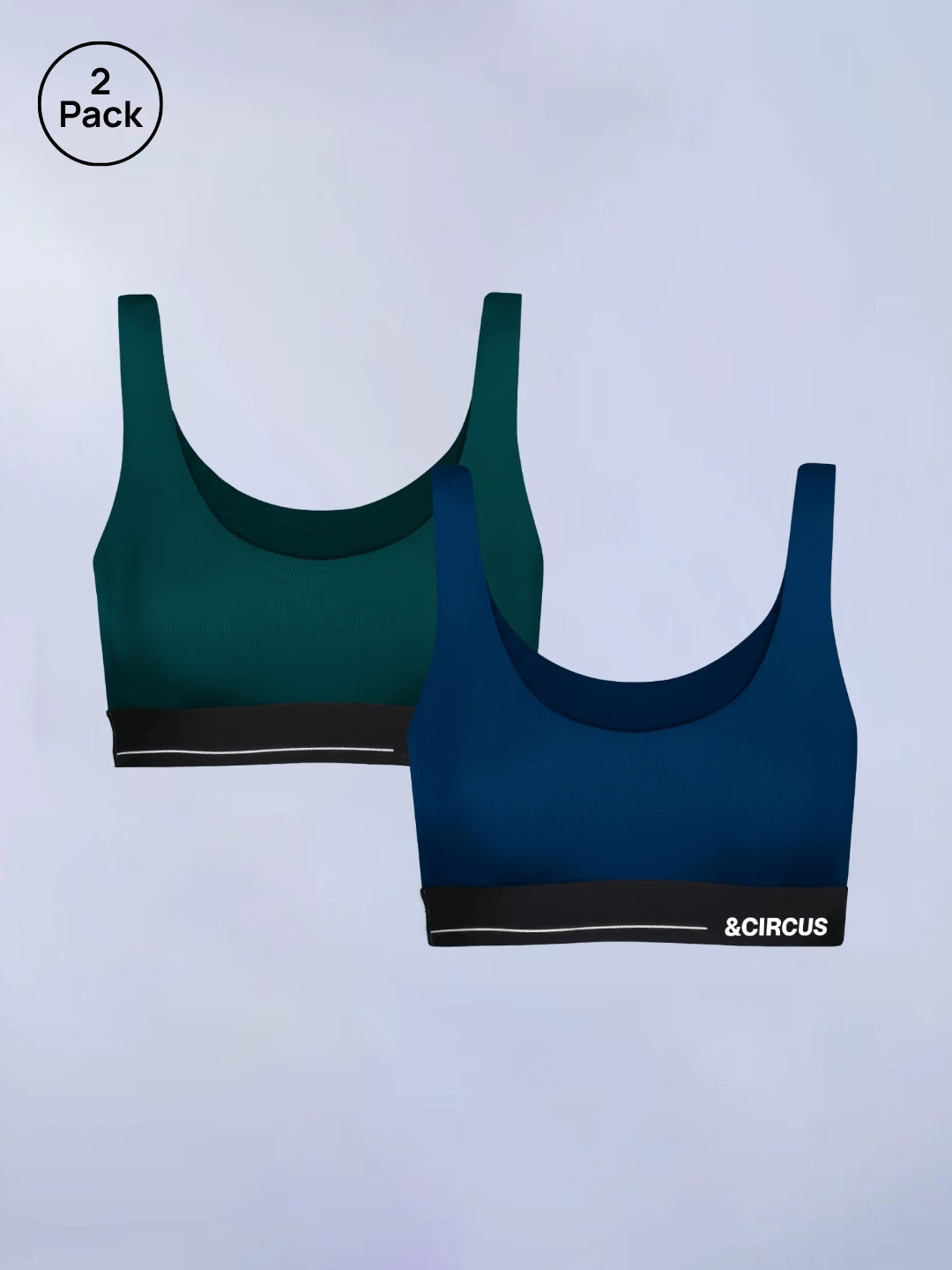 &Circus Pack of 2 Racing Green & Blue Curacao low-impact lounge bras for women are designed to give you support without discomfort; these bras have no hooks, no wires, just slip-on ease.