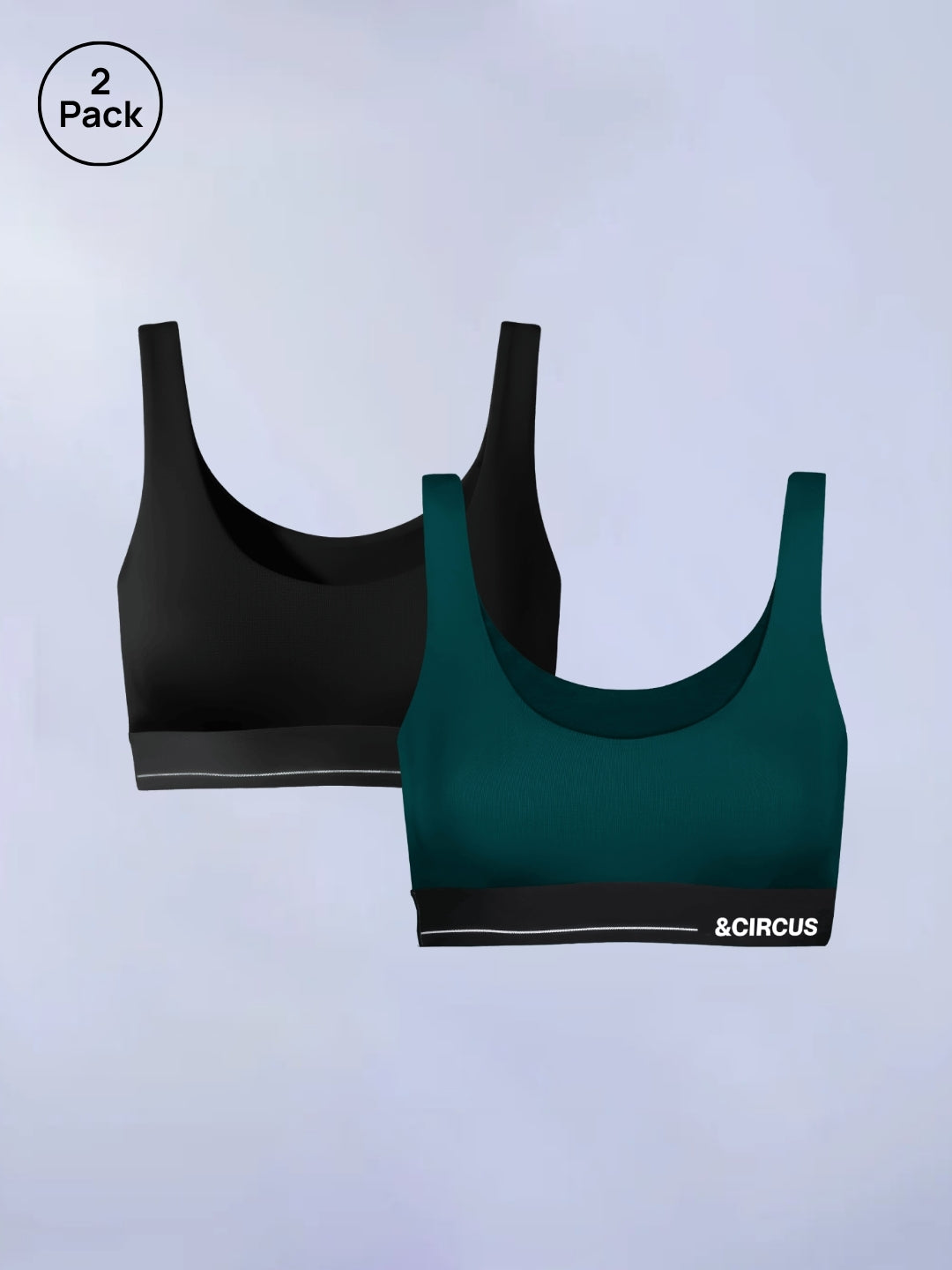 &Circus Pack of 2 Racing Green & Onyx low-impact lounge bras for women are designed to give you support without discomfort; these bras have no hooks, no wires, just slip-on ease.
