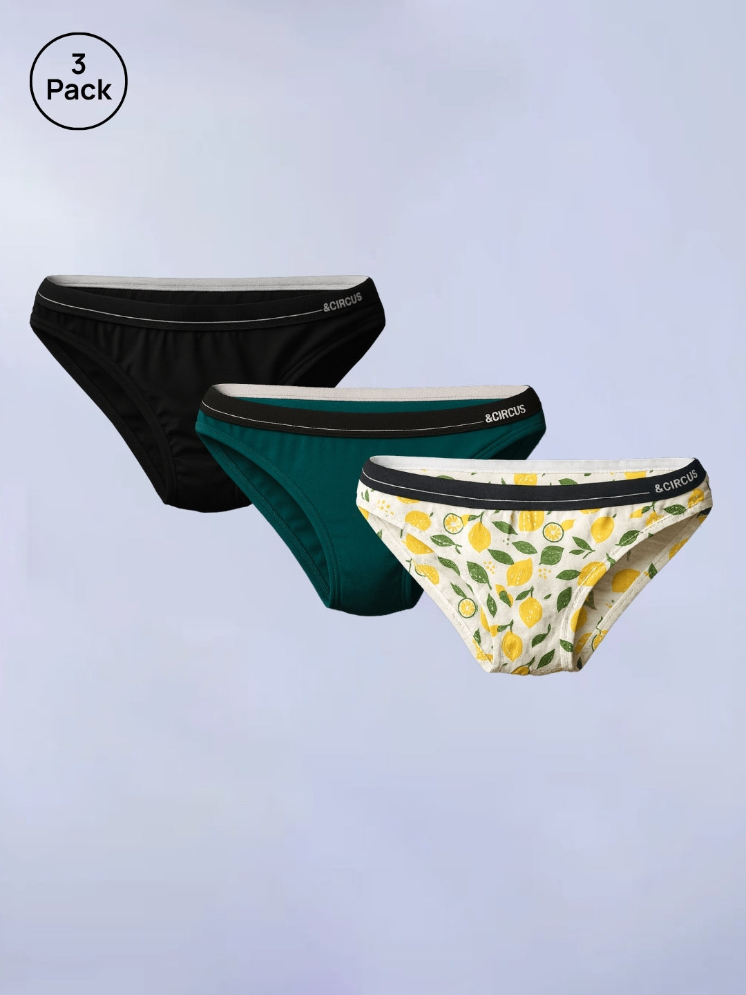 &Circus Pack of 3 Lemon Crush, Onyx & Racing Green bikini briefs for women are modelled after classic bikini briefs; low-rise & essential coverage; now they're hypoallergenic & breathable too.